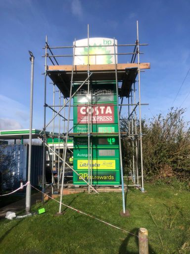 Our scaffolders have all the correct cards to enable them to work on petrol forecourts for scaffold to provide access for maintenance works and updating signage works.
